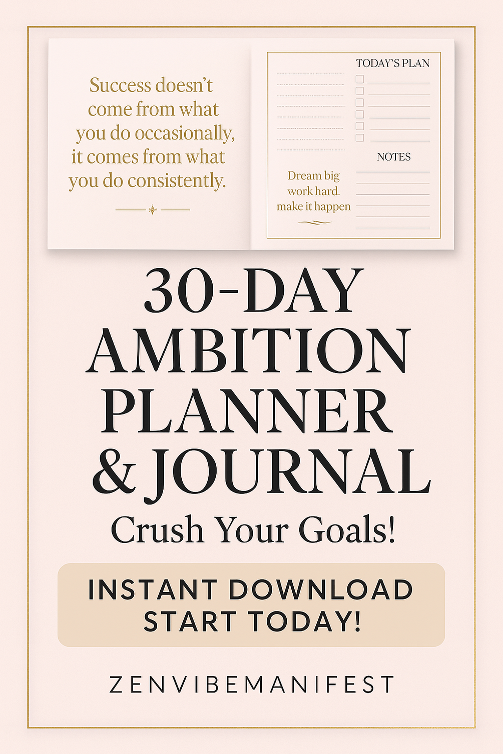 Achieve your biggest goals with this beautifully designed 30-Day Ambitious Planner. Packed with goal-setting prompts, daily trackers, and reflection pages, it's the perfect digital tool to level up your focus and productivity. Designed for dreamers, doers, and high achievers.
